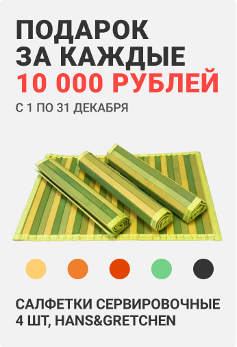 Получите в подарок набор сервировочных салфеток Hans&Gretchen за каждые потраченные 10 тысяч рублей. Количество и цвет подтверждается менеджером магазина при оформлении заказа.
